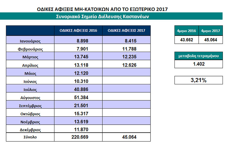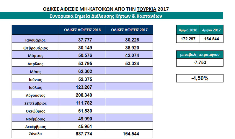 Μειωμένος ήταν ο αριθμός των αφίξεων από την Τουρκία στο τελωνείο των Κήπων, για το πρώτο τετράμηνο του 2017, σε σύγκριση με το αντίστοιχο τετράμηνο του 2016. Την ίδια στιγμή, μικρή αύξηση των αφίξεων παρατηρήθηκε στο τελωνείο των Καστανεών.