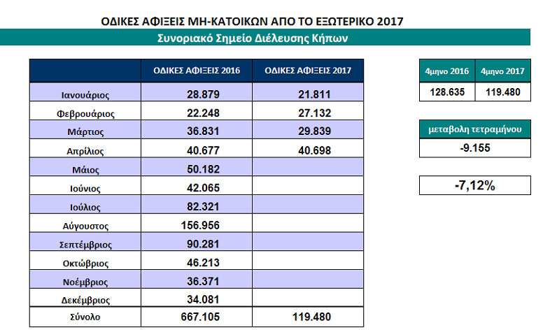Σημειώνουμε τέλος ότι από το σύνολο των 119.480 οδικών αφίξεων στους Κήπους κατά το πρώτο τετράμηνο του 2017, οι 77.069 (64,5%) ήταν Τούρκοι πολίτες, ενώ οι υπόλοιποι άλλων εθνικοτήτων.