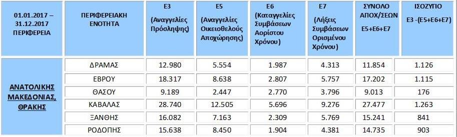 Συνολικά, το 2017 στον Έβρο υπήρξαν 18.317 θέσεις εργασίας και 17.202 αποχωρήσεις-απολύσεις, με το ισοζύγιο να διαμορφώνεται στις 1.115 περισσότερες θέσεις εργασίας από ό,τι αποχωρήσεις.