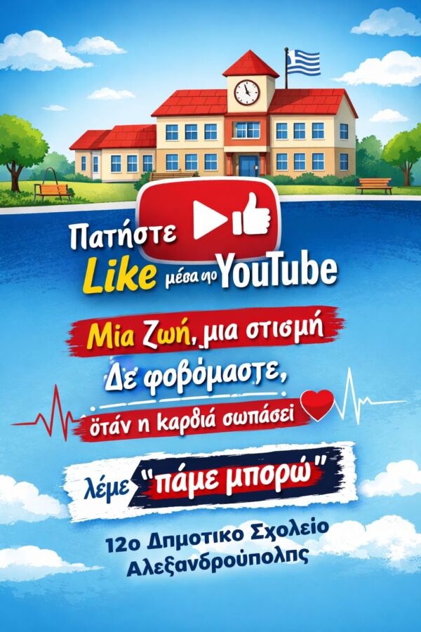 Το 12 Δημοτικό Σχολείο Αλεξανδρούπολης με τους μαθητές και τις μαθήτριες της ΣΤ’ τάξης και στο πλαίσιο του προγράμματος του Ενεργού Πολίτη, συμμετέχει με ιδιαίτερη χαρά και υπερηφάνεια στον Πανελλήνιο Μαθητικό Διαγωνισμό βίντεο «KIDS SAVE LIVES: NEXTGEN VIDEO 2026», μια σημαντική πρωτοβουλία που προάγει την αξία της προσφοράς, της γνώσης και της ανθρώπινης ζωής.
