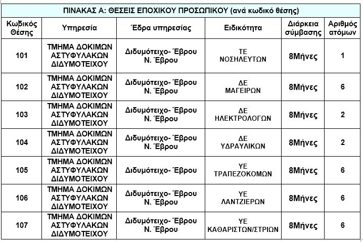 Πρόσληψη, με σύμβαση εργασίας ιδιωτικού δικαίου ορισμένου χρόνου ΑΣΕΠ, συνολικά 29 ατόμων για την κάλυψη εποχικών ή παροδικών αναγκών του ανακοίνωσε το Τμήμα Δοκίμων Αστυφυλάκων Διδυμοτείχου.