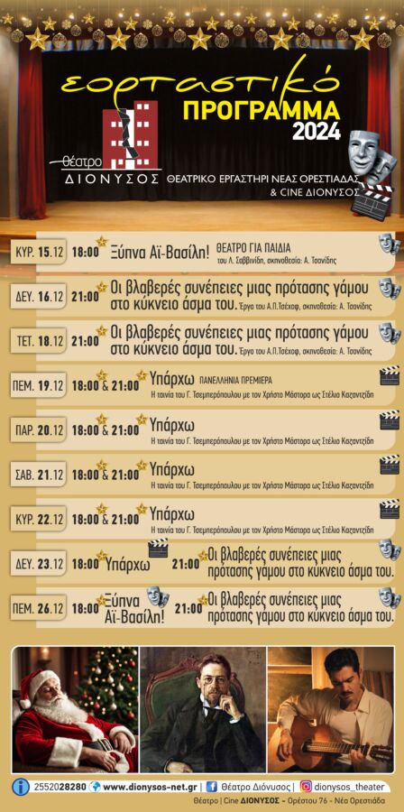 Με εναλλασσόμενες θεατρικές παραστάσεις για μικρούς και μεγάλους και κινηματογραφική ταινία πρώτης προβολής, το Θέατρο ΔΙΟΝΥΣΟΣ στην Ορεστιάδα συνεχίζει να δίνει τη δυνατότητα για ψυχαγωγία και διασκέδαση και κατά τη διάρκεια της εορταστικής περιόδου όπως κάθε χρόνο.
