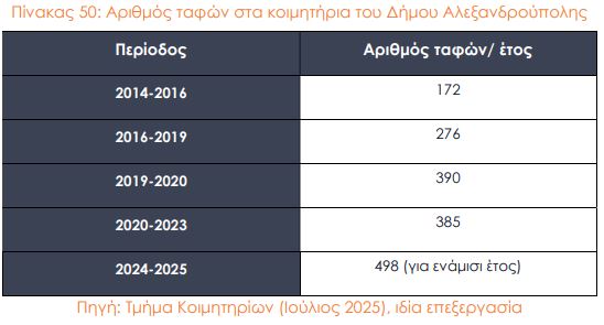 Ειδικά για τα δύο κοιμητήρια της Αλεξανδρούπολης η κατάσταση είναι οριακή, με δεδομένα την πολύ υψηλή πληρότητα και το ότι ο αριθμός των ταφών για το 2024 ήταν αρκετά υψηλός, συνολικά 410 (54 και 366 αντίστοιχα για τα Α’ και Β’ κοιμητήρια Αλεξανδρούπολης).