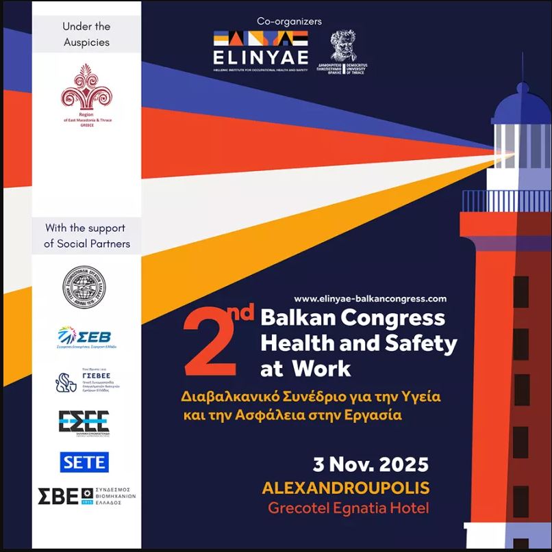 Το 2ο Διαβαλκανικό Συνέδριο για την Υγεία και την Ασφάλεια στην Εργασία (ΥΑΕ) διοργανώνει το Ελληνικό Ινστιτούτο Υγείας και Ασφάλειας στην Εργασία (ΕΛ.ΙΝ.Υ.Α.Ε.) σε συνεργασία με το Δημοκρίτειο Πανεπιστήμιο Θράκης στις 3 Νοεμβρίου 2025, στην Αλεξανδρούπολη, στο Grecotel Egnatia Hotel.
