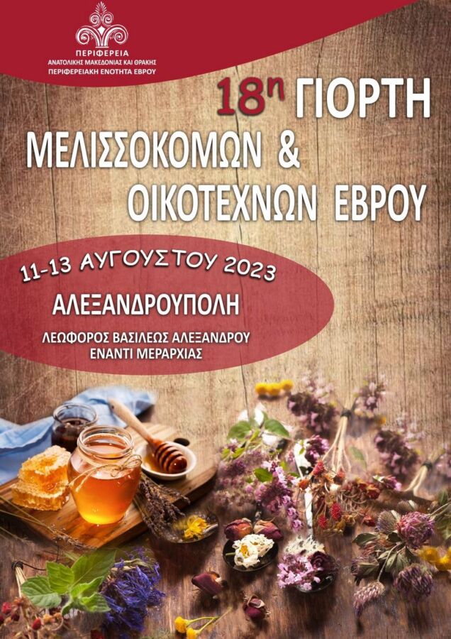 Η 18η Γιορτή Μελισσοκόμων και Οικοτεχνών Έβρου είναι γεγονός. Πρόκειται για έναν ετήσιο θεσμό που πραγματοποιείται κάθε καλοκαίρι στην Αλεξανδρούπολη από την Περιφέρεια Ανατολικής Μακεδονίας και Θράκης και την Περιφερειακή Ενότητα Έβρου σε συνεργασία με μελισσοκόμους και οικοτέχνες της ευρύτερης περιοχής του νομού.