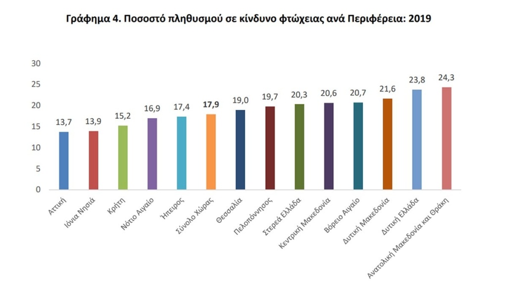 Σε πέντε Περιφέρειες (Αττική, Ιόνια Νησιά, Κρήτη, Νότιο Αιγαίο και Ήπειρος) καταγράφονται ποσοστά κινδύνου φτώχειας χαμηλότερα από αυτό της Χώρας, ενώ σε οκτώ Περιφέρειες (Θεσσαλία, Πελοπόννησος, Στερεά Ελλάδα, Κεντρική Μακεδονία, Βόρειο Αιγαίο, Δυτική Μακεδονία, Δυτική Ελλάδα και Ανατολική Μακεδονία και Θράκη) τα αντίστοιχα ποσοστά είναι υψηλότερα.