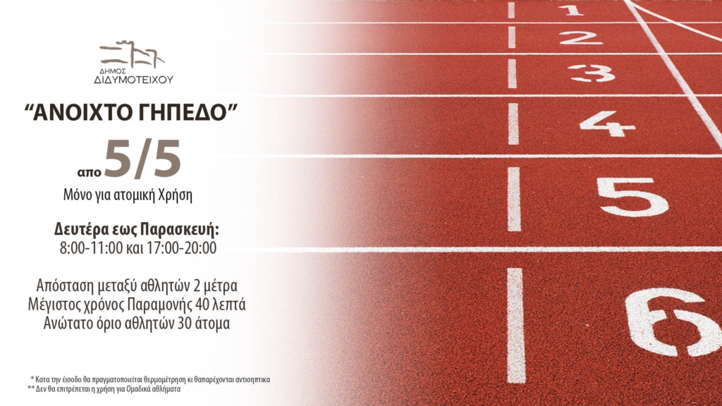 Στο πλαίσιο της χαλάρωσης των μέτρων, από την Τρίτη  5/5/2020 το ανοικτό γήπεδο Διδυμοτείχου θα είναι διαθέσιμο για χρήση από τους πολίτες, με περιορισμούς.