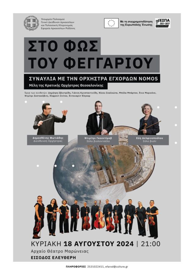 Την Κυριακή 18 Αυγούστου 2024 και ώρα 21:00 στο Αρχαίο Θέατρο Μαρώνειας η Εφορεία Αρχαιοτήτων Ροδόπης θα γιορτάσει την Πανσέληνο του Αυγούστου με τη συναυλία «Στο φως του φεγγαριού» της ορχήστρας Εγχόρδων NOMOS στο πλαίσιο προβολής του έργου «Προστασία και αναβάθμιση υποδομών αρχαίου θεάτρου Μαρώνειας».