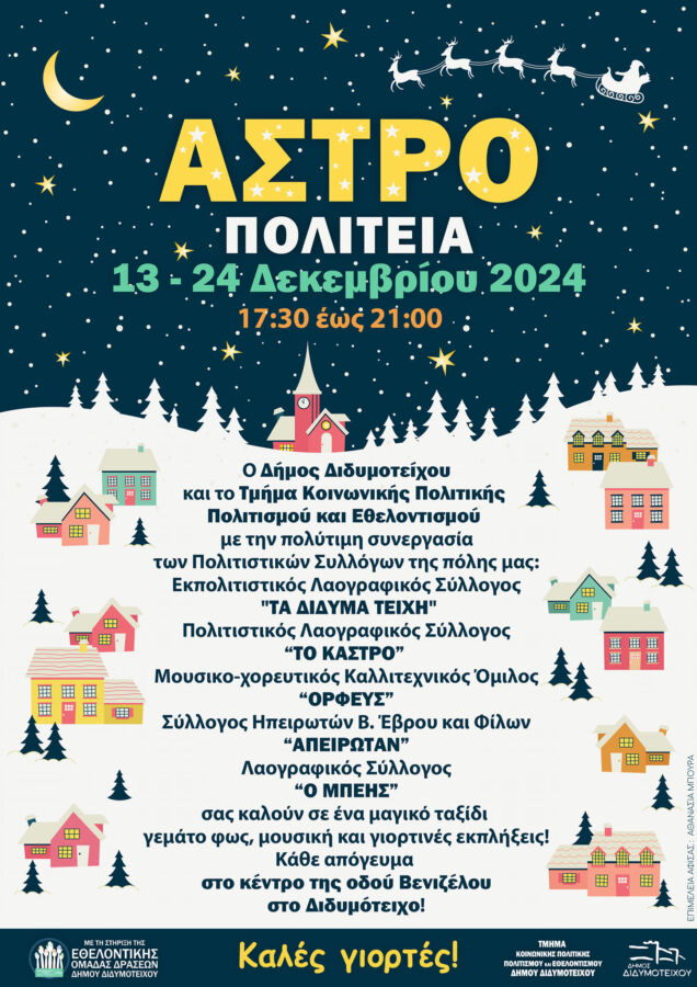 Με αγάπη, αλληλεγγύη και συνεργασία, οι Σύλλογοι, οι Εθελοντές και το Τμήμα Κοινωνικής Πολιτικής, Πολιτισμού και Εθελοντισμού του Δήμου Διδυμοτείχου ενώνουν τις δυνάμεις τους για να δημιουργήσουν την μαγευτική Αστροπολιτεία!