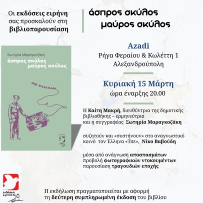 Στην Αλεξανδρούπολη και το “Συνεργατικό καφέ/βιβλιοπωλείο/μπαρ AZADI” την Κυριακή 15 Μαρτίου με αφορμ...