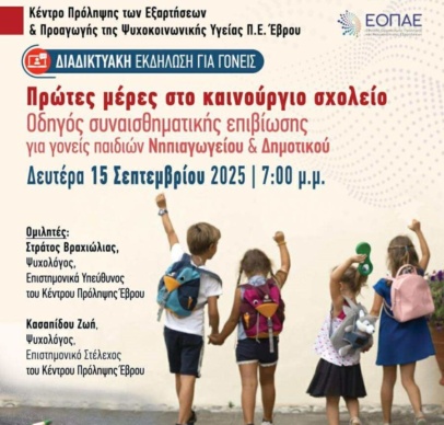 Έβρος Κοινωνία Παιδεία Διαδικτυακή εκδήλωση Κέντρου Πρόληψης Εβρου για γονείς μικρών μαθητών 12 Σεπτεμβρίου 2025 by news-room 0Likes 0Σχόλια «Πρώτες μέρες στο καινούριο σχολείο – Οδηγός συναισθηματικής επιβίωσης για γονείς» Η έναρξη της νέας σχολικής χρο...