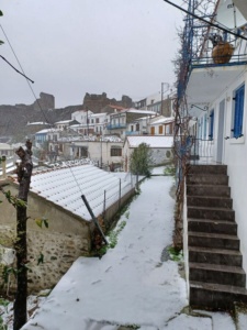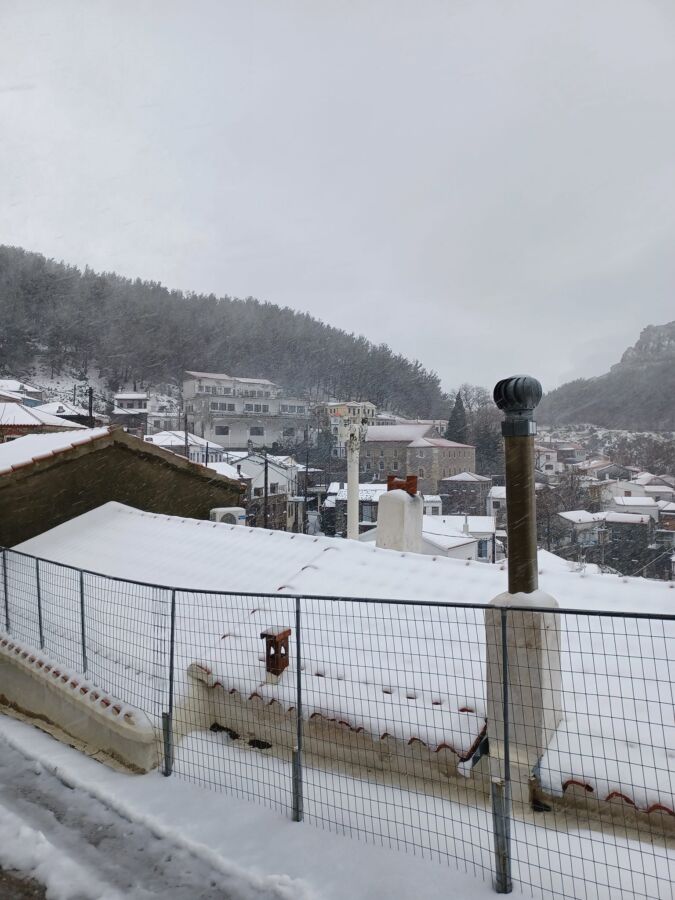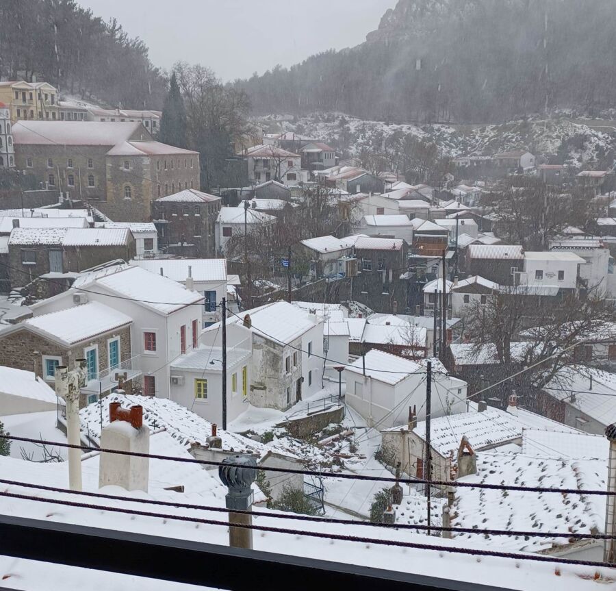 Η χιονόπτωση άρχισε να σκεπάζει τα σπίτια και τους δρόμους της Χώρας, δημιουργώντας ένα πανέμορφο λευκό τοπίο