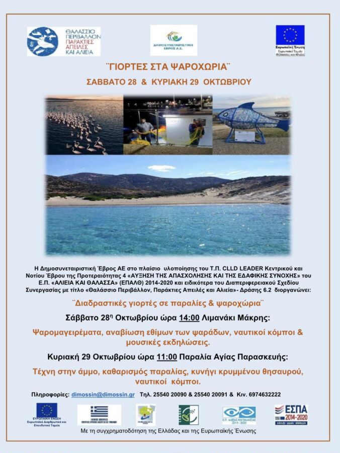 Διοργανώνονται το Σαββατοκύριακο «διαδραστικές γιορτές σε παραλίες και ψαροχώρια» με πλούσιο πρόγραμμα. Πληθώρα δράσεων, εκδηλώσεων, παιχνιδιών, εθελοντικών παρεμβάσεων, μουσικής και γαστρονομικών εκπλήξεων