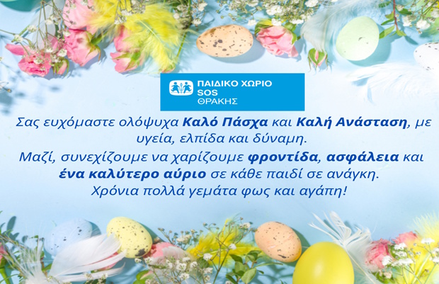 Εν όψει των εορτών του Πάσχα, το Παιδικό Χωριό SOS Θράκης εκφράζει τις θερμές του ευχαριστίες “σε όλους εσάς που, με αγάπη και ευαισθησία, στηρίξατε το έργο μας. Οι πολύτιμες δωρεές σας, υλικές και χρηματικές, προσέφεραν χαρά, ελπίδα και ασφάλεια στα παιδιά που μεγαλώνουν στο Χωριό μας. Χάρη στη δική σας προσφορά, καταφέραμε να δημιουργήσουμε ένα γιορτινό και ζεστό περιβάλλον, γεμάτο χαμόγελα και όμορφες στιγμές, όπως αξίζει σε κάθε παιδί.