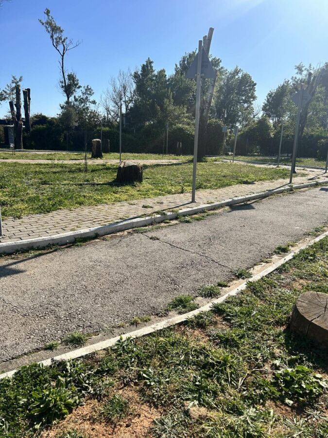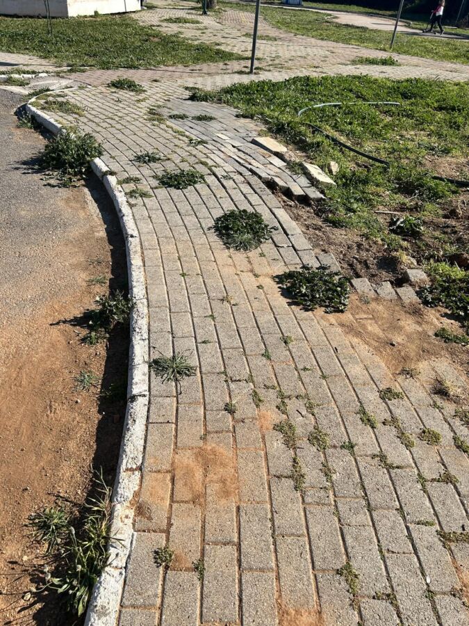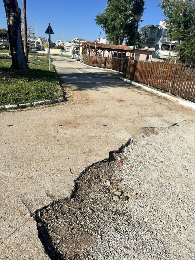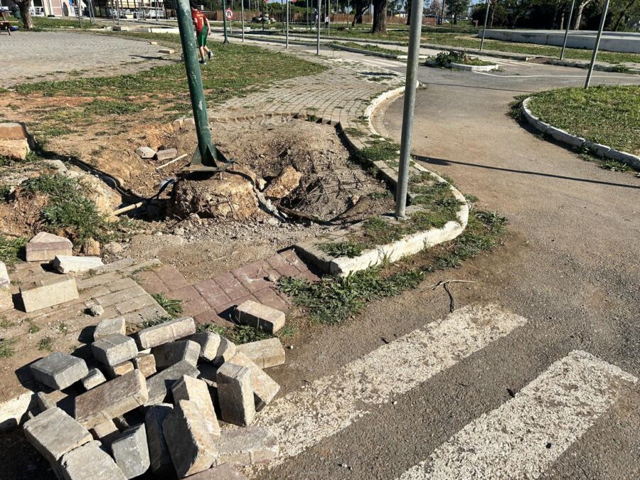 Η εικόνα συμπληρώνεται από κατεστραμμένα παρτέρια, κυβόλιθους που έχουν αποκολληθεί και μια γενικότερη αίσθηση εγκατάλειψης και έλλειψης φροντίδας.