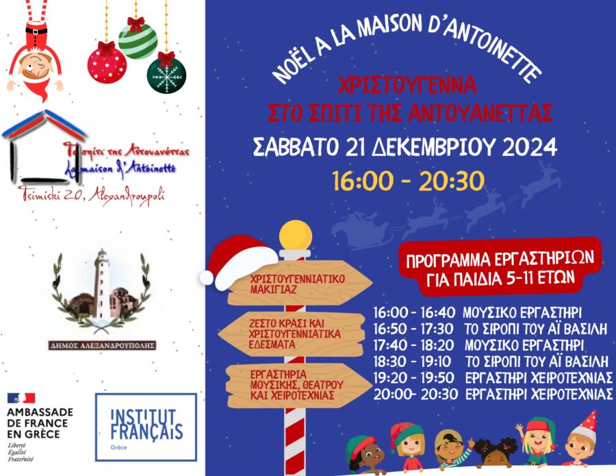 Μια όμορφη Χριστουγεννιάτικη ατμόσφαιρα με πολλές δράσεις, κεράσματα και μουσική θα περιμένει μικρούς και μεγάλους στο φιλόξενο Σπίτι της Αντουανέττας, το Σάββατο, στις 21 Δεκεμβρίου.