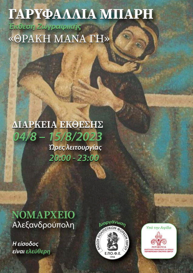 Η Ένωση Πολιτιστικών Φορέων Έβρου (Ε.ΠΟ.Φ.Ε.) σας προσκαλεί στην Έκθεση Ζωγραφικής της ζωγράφου Γαρυφαλλιάς Μπαρή στο Νομαρχείο Αλεξανδρούπολης.