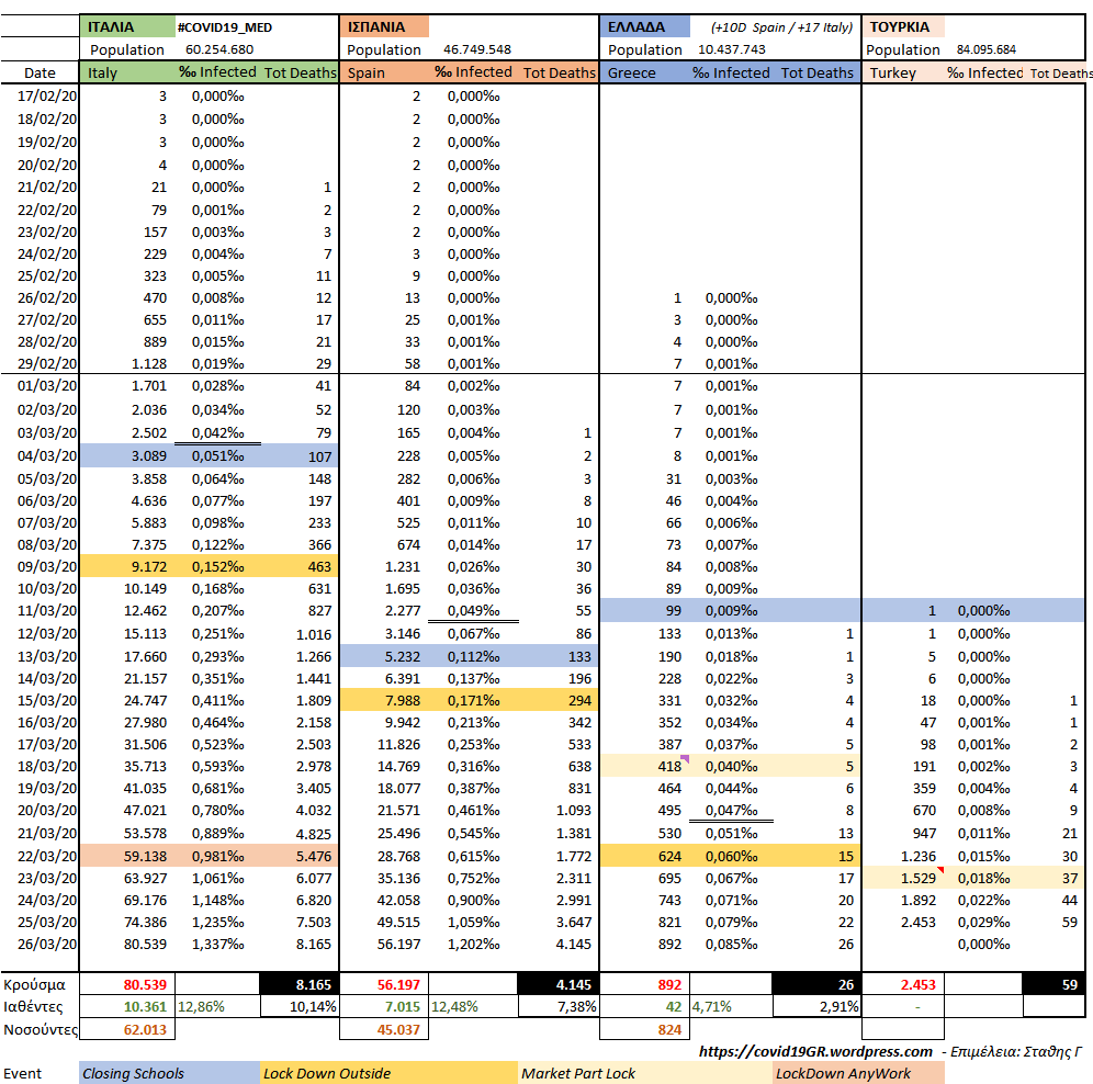 Στατιστικά στοιχεία για την εξάπλωση της επιδημίας για την Ιταλία, Ισπανία, Ελλάδα και Τουρκία