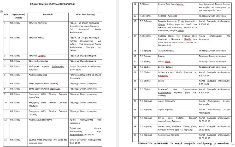 Στην ενίσχυση των μέτρων βιοασφάλειας με στόχο την αποτελεσματική προστασία του ζωϊκού κεφαλαίου, προχωρά η Περιφέρεια Ανατολικής Μακεδονίας και Θράκης. Στο πλαίσιο αυτό, λειτουργούν απολυμαντικές τάφροι, σημεία απολύμανσης και υγειονομικές πύλες, σύμφωνα με τον σχεδιασμό και στα καθορισμένα σημεία, που παρατίθενται στον παρακάτω πίνακα, διασφαλίζοντας αυξημένο επίπεδο πρόληψης και ελέγχου.