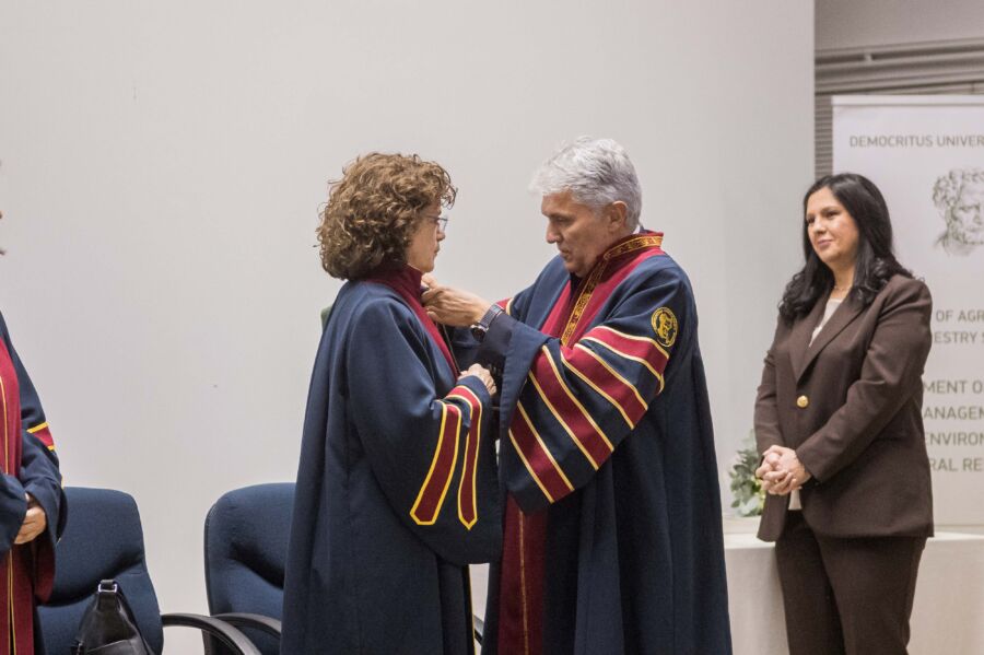 Μετά την ανάγνωση του Ψηφίσματος Αναγόρευσης από τον Πρόεδρο του Τμήματος Καθηγητή Γεώργιο Τσαντόπουλο, ακολούθησε η Περιένδυση της τιμώμενης από τον Πρύτανη του ΔΠΘ και η Επίδοση των Μεμβρανών .
