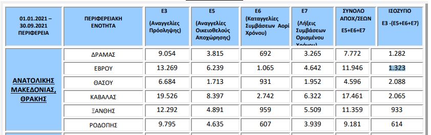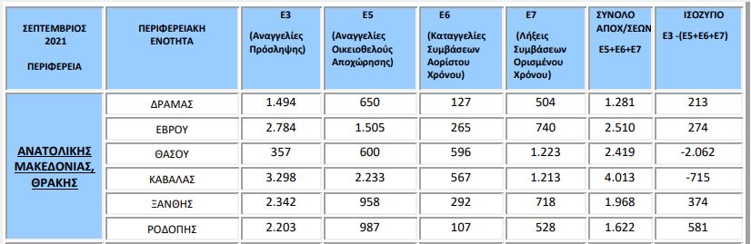 Στον Έβρο, τον Σεπτέμβριο του 2021 είχαμε 2.784 αναγγελίες πρόσληψης και 2.510 αποχωρήσεις, με το ισοζύγιο να είναι θετικό κατά μόλις 274 θέσεις εργασίας.