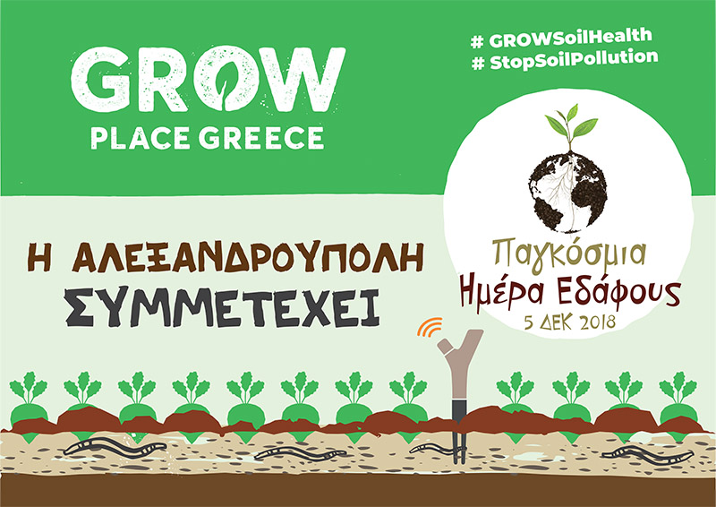 Η Παγκόσμια Ημέρα Εδάφους του ΟΗΕ, γιορτάζεται κάθε χρόνο στις 5 Δεκεμβρίου με στόχο να ευαισθητοποιήσει την κοινωνία για την αειφόρο διαχείριση των εδαφών. Φέτος το θέμα είναι “Σταματήστε τη ρύπανση του εδάφους” και χιλιάδες πολίτες ανά τον κόσμο συντονίζονται σε κοινές εκδηλώσεις και εκστρατείες ενημέρωσης. Η Αλεξανδρούπολη συμμετέχει στη διεθνή αυτή δράση, μέσα από μία σειρά θεματικών εκδηλώσεων για μαθητές και ενήλικες, που διοργανώνει η τοπική κοινότητα του GROW Observatory (Παρατηρητήριο GROW) μεταξύ 1-5 Δεκεμβρίου 2018.