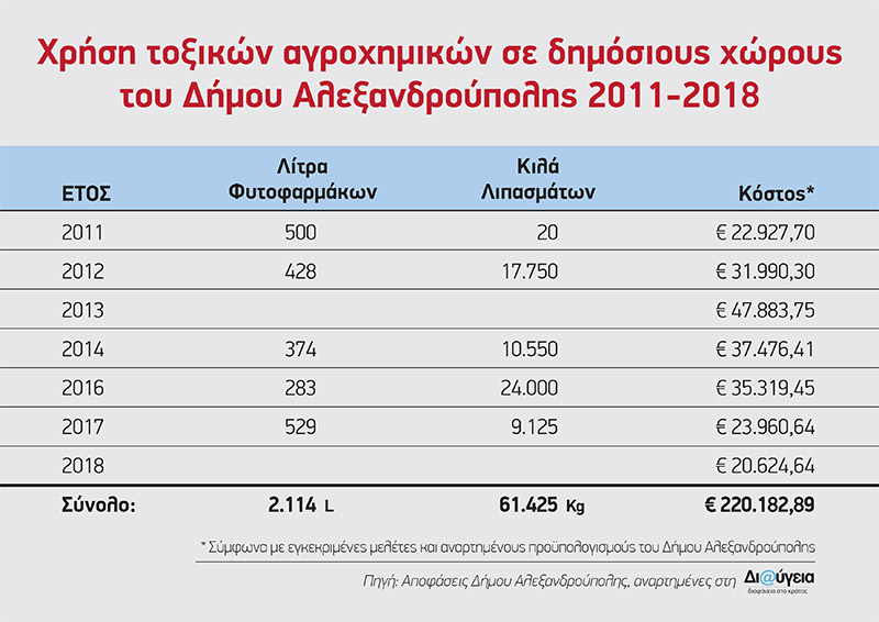 Συγκεκριμένα, την τελευταία επταετία ο Δήμος Αλεξανδρούπολης φαίνεται να προμηθεύτηκε περισσότερους από 2 τόνους φυτοφαρμάκων και 61 τόνους λιπασμάτων. Αυτά χρησιμοποιούνται για την καταπολέμηση ζιζανίων, εντόμων και μυκητών που υπάρχουν “σε χώρους πρασίνου των κοινόχρηστων χώρων του καλλικρατικού δήμου καθώς και των κοιμητηρίων του Δήμου Αλεξανδρούπολης”. Καθώς και για να καλυφθούν οι ανάγκες σε λίπανση που προκύπτουν σε κοινόχρηστους χώρους πρασίνου, όπως “νησίδες, πάρκα και παρτέρια φυτεμένα με γκαζόν και καλλωπιστικά φυτά”.