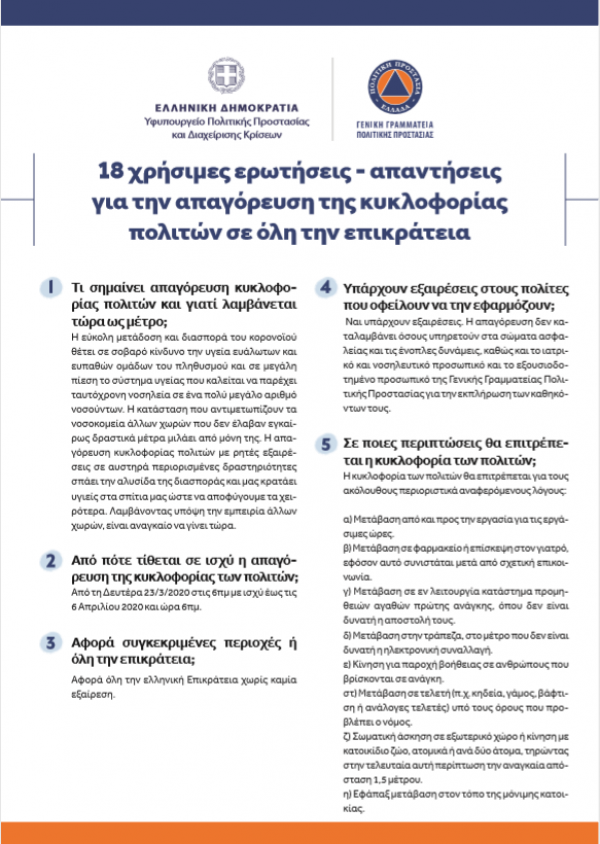 ΓΕΝΙΚΗ ΓΡΑΜΜΑΤΕΙΑ ΠΟΛΙΤΙΚΗΣ ΠΡΟΣΤΑΣΙΑΣ:  18 χρήσιμες ερωτήσεις – απαντήσεις για την απαγόρευση κυκλοφορίας πολιτών