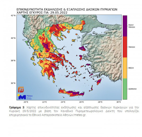 Επικίνδυνες πυρομετεωρολογικές συνθήκες αναμένονται κατά τόπους κυρίως σε τμήματα της ανατολικής και νότιας χώρας λόγω των υψηλών θερμοκρασιών, της ξηρής ατμόσφαιρας και των ενισχυμένων ανέμων. Υψηλός/πολύ υψηλός κίνδυνος εκδήλωσης και εξάπλωσης δασικών πυρκαγιών αναμένεται σε τμήματα της Κ. & Α. Μακεδονίας, Θράκης, Θεσσαλίας, Α. Στερεάς, Αττικής, Εύβοιας, Α. Πελοποννήσου, Β. Κρήτης, Ρόδου, Σάμου, Κω, Χίου και Λέσβου. Το meteo συνιστά αποφυγή κάθε χρήσης φωτιάς.