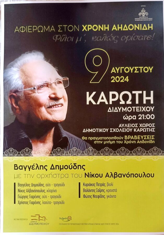 Ο Έβρος τιμάει τον δάσκαλο την Παρασκευή 9 Αυγούστου 2024 στις 21:00 στον αύλειο χώρο του .δημοτικού σχολείου Καρωτής.