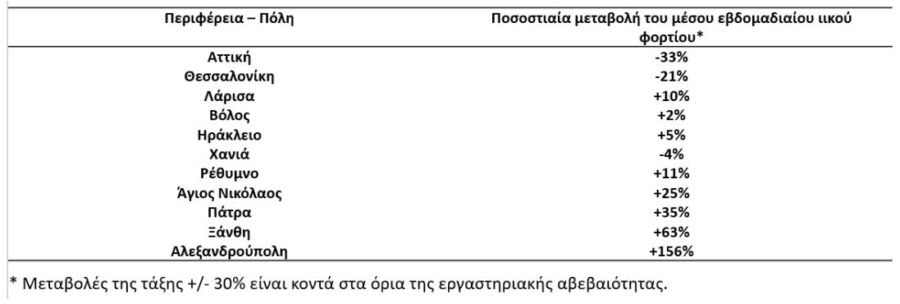 Πίνακας 1: Ποσοστιαία μεταβολή στη μέση εβδομαδιαία συγκέντρωση του ιικού φορτίου του SARS-CoV-2 στα αστικά λύματα ανά 100.000κατοίκους την εβδομάδα 19-25 Απριλίου 2021 σε σχέση με την εβδομάδα 12-18 Απριλίου 2021.