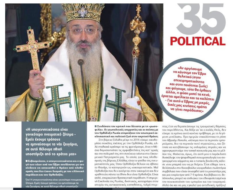 «Όχι! Η υπογεννητικότητα είναι γενικότερο πνευματικό ζήτημα. Εμείς έχουμε τρόπους να εμπνεύσουμε τα νέα ζευγάρια, σ’ αυτό θέλουμε ηθική υποστήριξη από το Κράτος μας. Στη συνέχεια και η Πολιτεία ας τα στηρίξει, όχι απαραίτητα με επιδόματα αλλά και με υποδομές και θεσμικές παρεμβάσεις. Η ερημοποίηση της υπαίθρου παλαιότερα οφείλονταν στην αναζήτηση εργασίας αλλά τώρα πια στην αστυφιλία. Αν αργήσουμε να κάνουμε τον Έβρο θελτικό (στην επιχειρηματικότητα και στην ποιότητα ζωής) και φύγουμε, τότε θα ‘ρθουν άλλοι, η φύση μισεί τα κενά, έρχεται αμείλικτη και τα καλύπτει. Γι’ αυτό ο Έβρος με μικρές, δικές μας κινήσεις, πρέπει να γίνει παράδεισος και τότε ας έρθουν κι άλλοι. Τους άλλους δεν τους φοβόμαστε, τους θέλουμε επειδή ήδη μάθαμε να τους σεβόμαστε. Μέσα στην Ορθόδοξη παράδοση χωρούν όλες οι άλλες παραδόσεις. Αυτό, ήδη το ζούμε».