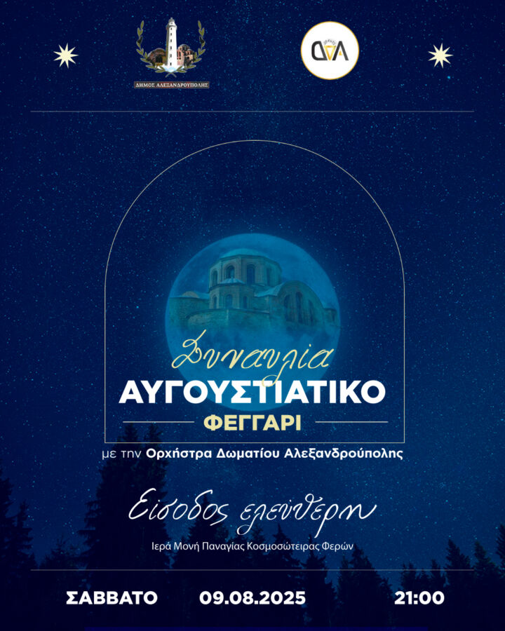 Μια ξεχωριστή πολιτιστική εκδήλωση θα πραγματοποιηθεί την Παρασκευή 9 Αυγούστου, στις 21:00, στον προαύλιο χώρο της Παναγίας Κοσμοσώτειρας στις Φέρες, με αφορμή την Αυγουστιάτικη Πανσέληνο.