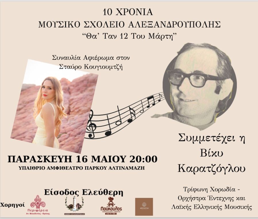 Το Μουσικό Σχολείο Αλεξανδρούπολης γιορτάζει φέτος 10 χρόνια δημιουργικής παρουσίας στην εκπαιδευτική και πολιτιστική ζωή της πόλης και σας προσκαλεί σε μια ξεχωριστή επετειακή συναυλία, αφιερωμένη στο έργο του μεγάλου Έλληνα συνθέτη Σταύρου Κουγιουμτζή, με τίτλο «Θα ’ταν 12 του Μάρτη». Μια βραδιά γεμάτη συγκίνηση, μελωδία και μνήμες, προς τιμήν ενός συνθέτη που άφησε ανεξίτηλο αποτύπωμα στο ελληνικό τραγούδι, αλλά και ως απολογισμός της δεκαετούς πορείας ενός σχολείου που υπηρετεί την τέχνη και τον πολιτισμό με αφοσίωση.