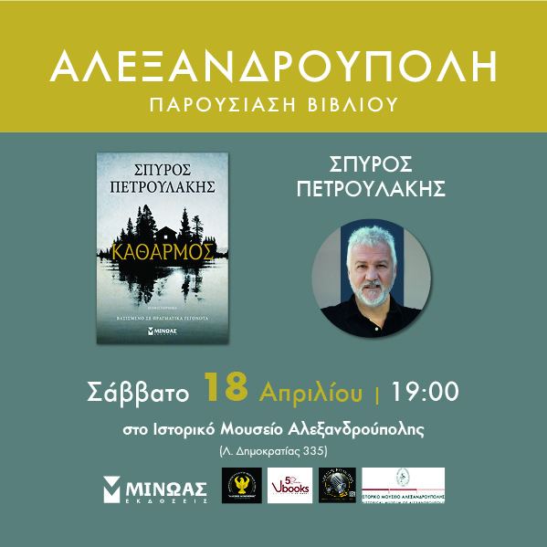 Το Βιβλιοπωλείο μας Βαταμίδης, ο Μορφωτικός Σύλλογος Ποντίων Ν. Έβρου «Αλέξιος Κομνηνός» και οι Εκδόσεις Μίνωας σας προσκαλούν στην παρουσίαση του νέου βιβλίου του Σπύρου Πετρουλάκη «Καθαρμός».