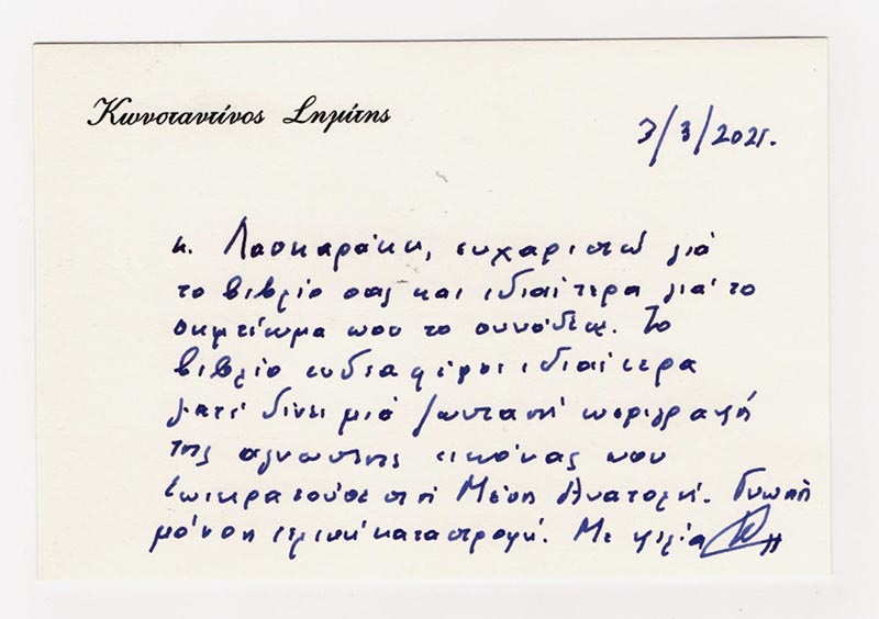Είναι μεγάλη τιμή για μένα που ο πρώην Πρωθυπουργός Κώστας Σημίτης, με ο πλούσιο συγγραφικό του έργο, διάβασε το βιβλίο που του έστειλα και συνόψισε σε μια φράση το περιεχόμενό του.