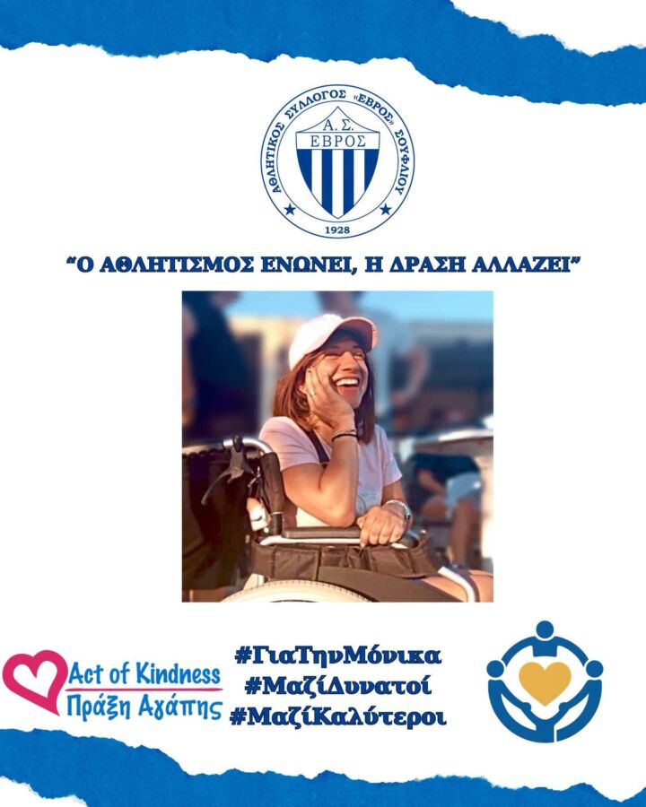 Ο Α.Σ. Έβρος Σουφλίου, στο πλαίσιο της κοινωνικής του δράσης και με οδηγό το σύνθημα «Ο Αθλητισμός Ενώνει, η Δράση Αλλάζει», στέκεται στο πλευρό της Μόνικας, μιας 36χρονης μητέρας από τον τόπο μας που δίνει τη δική της μάχη με τη σκλήρυνση κατά πλάκας.