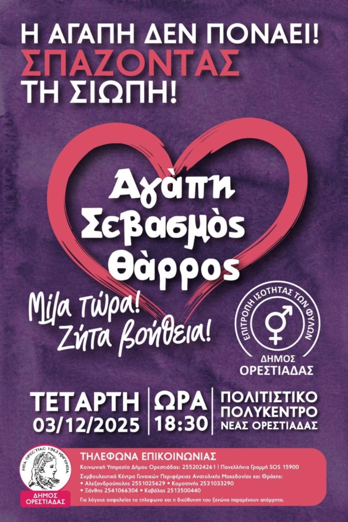 Ο Δήμος Ορεστιάδας και η Επιτροπή Ισότητας των Φύλων του Δήμου διοργανώνουν μια σημαντική δράση την Τετάρτη 3 Δεκεμβρίου στος 18.30 στο Πολιτιστικό Πολύκεντρο ενημέρωσης και ευαισθητοποίησης για την έμφυλη βία.