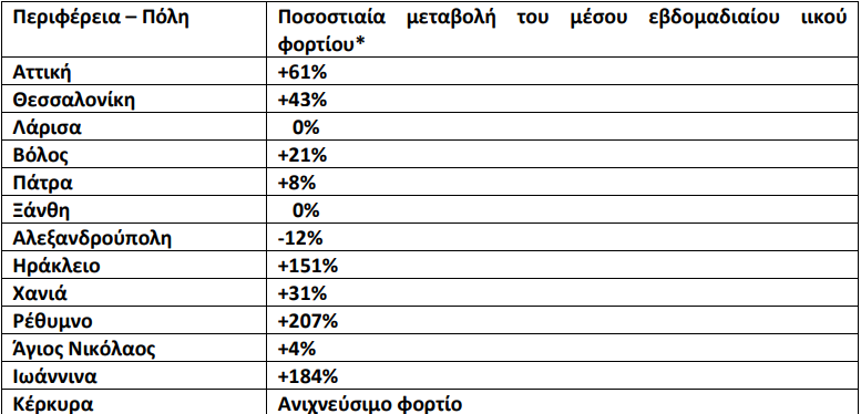Οι καθαρές αυξήσεις κυμάνθηκαν από +31% στα Χανιά έως +207% στο Ρέθυμνο, ενώ οριακή ήταν η αύξηση που παρατηρήθηκε στο Βόλο (+21%). Σταθερό παρέμεινε το ιικό φορτίο των αστικών λυμάτων στη Λάρισα (0%), στην Ξάνθη (0%), στον Άγιο Νικόλαο (+4%) και στην Πάτρα (+8%). Οριακή μείωση στο μέσο εβδομαδιαίο ιικό φορτίο των αστικών λυμάτων παρατηρήθηκε στην Αλεξανδρούπολη (-12%). Ανιχνεύσιμο ήταν το ιικό φορτίο στα αστικά λύματα της πόλης της Κέρκυρας. Σημειώνεται ότι δεν μπορεί να αξιολογηθεί η μεταβολή στον εβδομαδιαίο μέσο όρο του ιικού φορτίου σε σχέση με την προηγούμενη εβδομάδα, καθώς το ιικό φορτίο των αστικών λυμάτων δεν ήταν ανιχνεύσιμο τότε.
