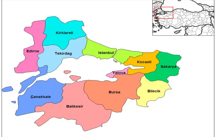 (Χάρτης 1: Νομοί της Τουρκίας. Αριστερά στον χάρτη εικονίζεται ο Νομός Αδριανούπολης (Edirne))