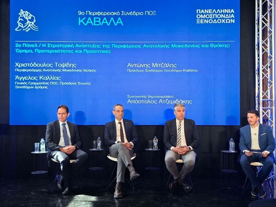 Στο πλαίσιο του 9ου Περιφερειακού Συνεδρίου της Πανελλήνιας Ομοσπονδίας Ξενοδόχων που πραγματοποιήθηκε στην Καβάλα, στην αίθουσα της Μεγάλης Λέσχης, ο Περιφερειάρχης Ανατολικής Μακεδονίας και Θράκης, Χριστόδουλος Τοψίδης, παρουσίασε την ολοκληρωμένη στρατηγική τουριστικής ανάπτυξης της Περιφέρειας, με τίτλο: «Όραμα, Προτεραιότητες και Προοπτικές».