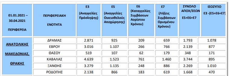 Σε επίπεδο τετραμήνου, από τον Ιανουάριο ως και τον Απρίλιο, στον Έβρο έγιναν 3.016 προσλήψεις και 2.139 αποχωρήσεις. Έτσι, το ισοζύγιο μεταξύ προσλήψεων και αποχωρήσεων ήταν θετικό κατά 877 θέσεις εργασίας.