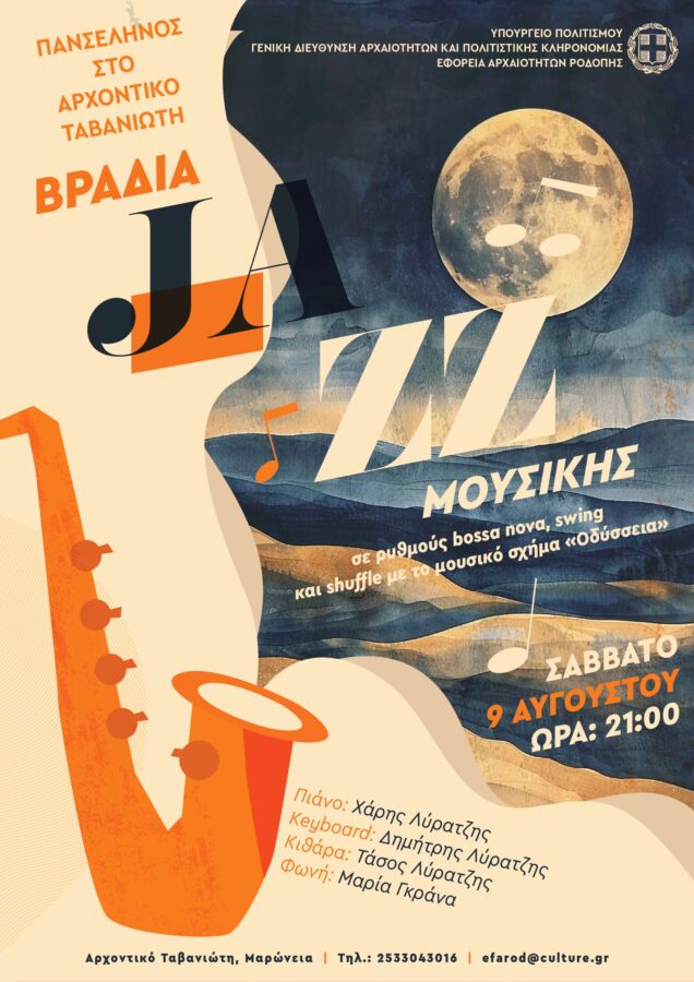 Το Σάββατο 9 Αυγούστου 2025 στις 21:00 η Εφορεία Αρχαιοτήτων Ροδόπης θα γιορτάσει την Πανσέληνο του Αυγούστου στο Αρχοντικό Ταβανιώτη στη Μαρώνεια. Το μουσικό σχήμα «Οδύσσεια» θα παρουσιάσει κομμάτια σε ρυθμούς bossa nova, swing και shuffle.