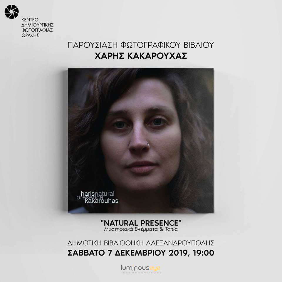 Το Κέντρο Δημιουργικής Φωτογραφίας Θράκης με χαρά σας προσκαλεί στην παρουσίαση του νέου φωτογραφικού βιβλίου του Χάρη Κακαρούχα “Natural Presence” η οποία θα πραγματοποιηθεί στη Δημοτική Βιβλιοθήκη Αλεξανδρούπολης, το Σάββατο 7 Δεκεμβρίου 2019 στις 19:00.