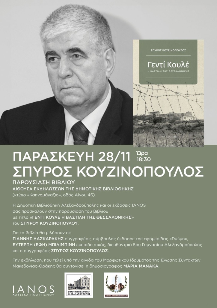 Η Δημοτική Βιβλιοθήκη Αλεξανδρούπολης και οι εκδόσεις ΙΑΝΟΣ, παρουσιάζουν την Παρασκευή 28 Νοεμβρίου, ώρα 18:30 στην αίθουσα εκδηλώσεων της Δημοτικής