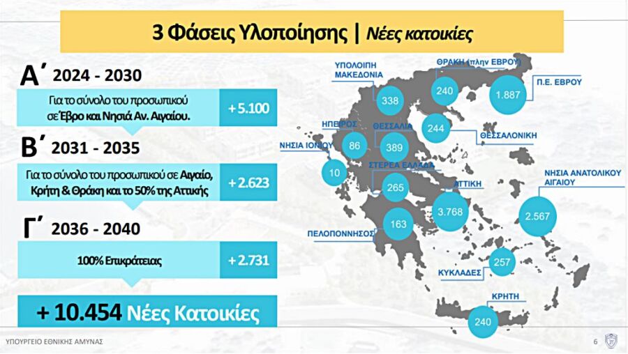– Α’ Φάση: Κατασκευή περισσότερων από 5.100 για το σύνολο του προσωπικού σε Έβρο και νησιά του Ανατολικού Αιγαίου για την περίοδο έως 2030. Η πρώτη φάση ξεκίνησε το 2024 και έως τον Δεκέμβριο του 2026 θα παραδοθούν περισσότερες από 1.059 κατοικίες.