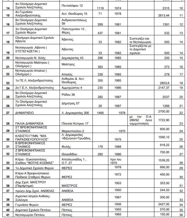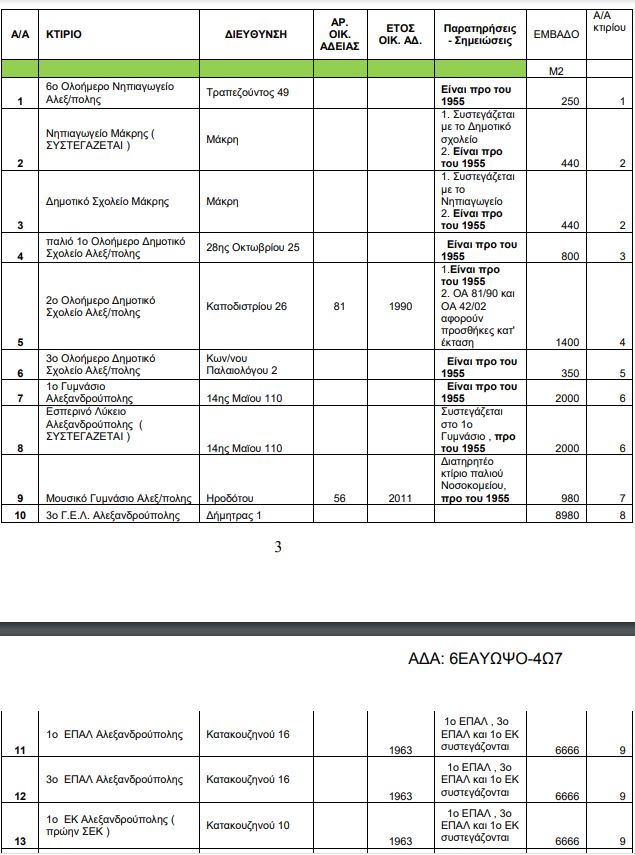 Ο Δήμος Αλεξανδρούπολης διαθέτει 9 σχολικά κτίρια που έχουν κατασκευαστεί πριν το 1955, τρία κτίρια για τα οποία οι οικοδομικές άδειες εκδόθηκαν το 1963, 2 με οικοδομική άδεια το 1974 και το  το 1978 αντίστοιχα και 13 σχολεία με τις οικοδομικές τους άδειες να εκδίδονται μεταξύ 1981 και 1988. Είναι αυτονόητο πως παρά τις παρεμβάσεις που γίνονται κατά  καιρούς, τα κτίρια είναι παλιά και σίγουρα χρήζουν αντισεισμικών ελέγχων.