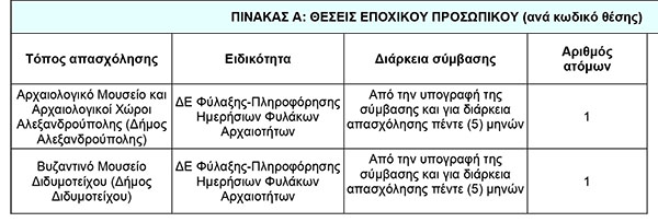 Η Εφορεία Αρχαιοτήτων Έβρου ανακοινώνει την πρόσληψη, με σύμβαση εργασίας ιδιωτικού δικαίου ορισμένου χρόνου, συνολικά δύο (2) ατόμων για την κάλυψη εποχικών ή παροδικών αναγκών της Εφορείας Αρχαιοτήτων Έβρου, που εδρεύει στην Αλεξανδρούπολη και συγκεκριμένα του εξής, ανά υπηρεσία, τόπο απασχόλησης, ειδικότητα και διάρκεια σύμβασης, αριθμού ατόμων (βλ. ΠΙΝΑΚΑ Α), με τα αντίστοιχα απαιτούμενα (τυπικά και τυχόν πρόσθετα) προσόντα (βλ. ΠΙΝΑΚΑ Β):