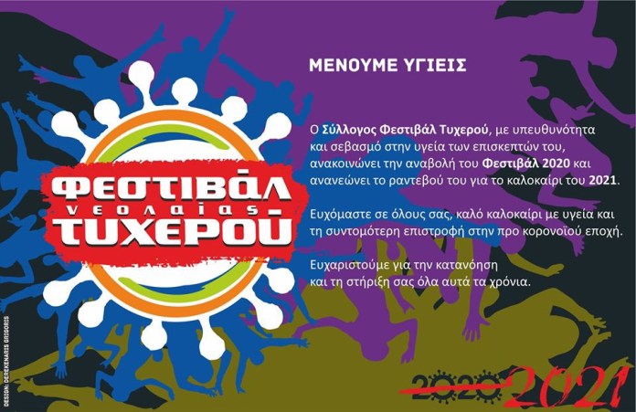 Ο σύλλογος που διοργανώνει το Φεστιβάλ Νεολαίας Τυχερού, με υπευθυνότητα και σεβασμό στην υγεία των επισκεπτών του, ανακοινώνει την αναβολή του Φεστιβάλ 2020 και ανανεώνει το ραντεβού του για το καλοκαίρι του 2021.