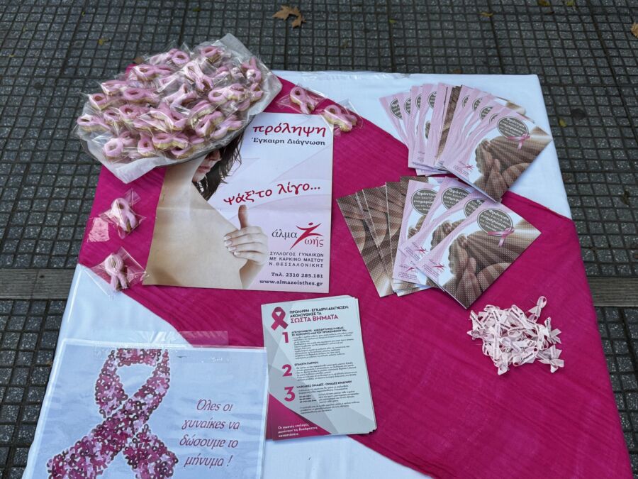 Στη δράση αυτή μοιράσαμε έντυπο υλικό το οποίο μας παραχώρησε ο Πανελλήνιος Σύλλογος Γυναικών με Καρκίνο Μαστού «Άλμα ζωής» , τους οποίους ευχαριστούμε θέρμα. Επίσης, μοιράσαμε κορδελάκια και μπισκοτάκια με το σήμα της ροζ κορδέλας.